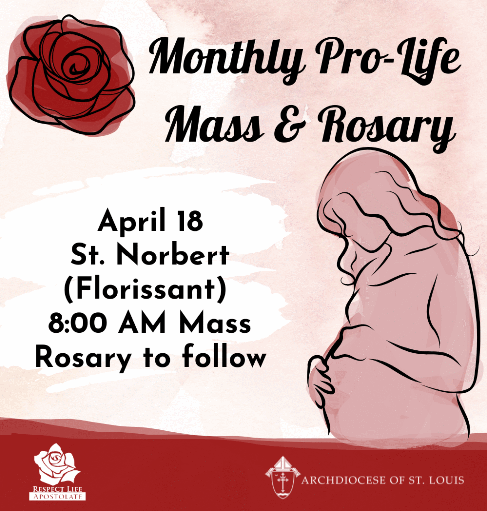 Join us in thanking God for His precious gift of life and in praying for pregnant mothers and their preborn children. This month’s Archdiocesan Pro-life Mass and Rosary will be held Saturday, April 18 at St. Norbert (Florissant) located at 16455 New Halls Ferry Road, Florissant, MO 63031. Mass begins at 8 a.m. with the Rosary immediately following.