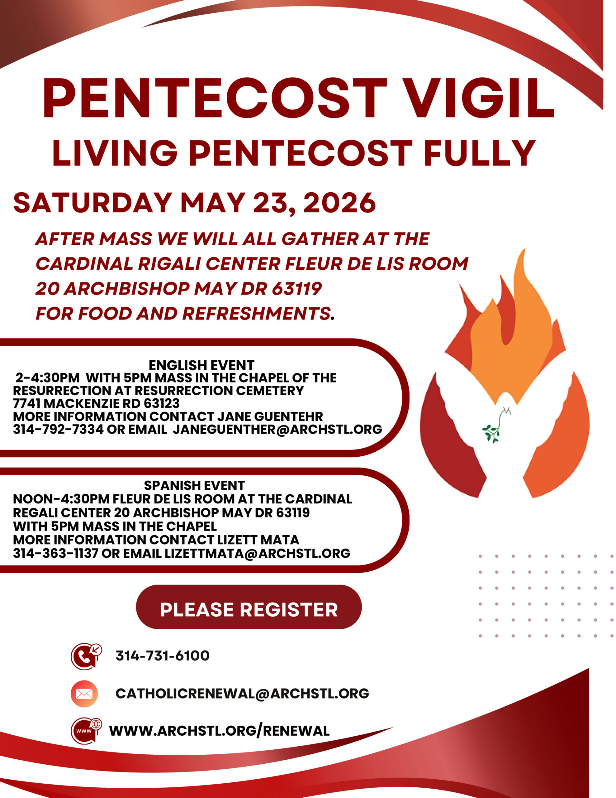 Cardinal Rigali Center 20 Archbishop May Drive, St. Louis, MO, United StatesPENTECOST VIGIL REGISTRATION Saturday May 23, 2 026 Living Pentecost Fully Join us for these free, family-friendly praise, worship and fellowship events After Mass we will gather at the Cardinal…