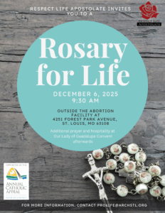 Each month since January 2000, the Archdiocese of St. Louis has held a pro-life Mass & Rosary on the third Saturday. The prayer vigil, held either at the Cathedral Basilica of St. Louis or a host parish, includes Saturday morning Mass and the Holy Rosary prayed either before or after Mass.